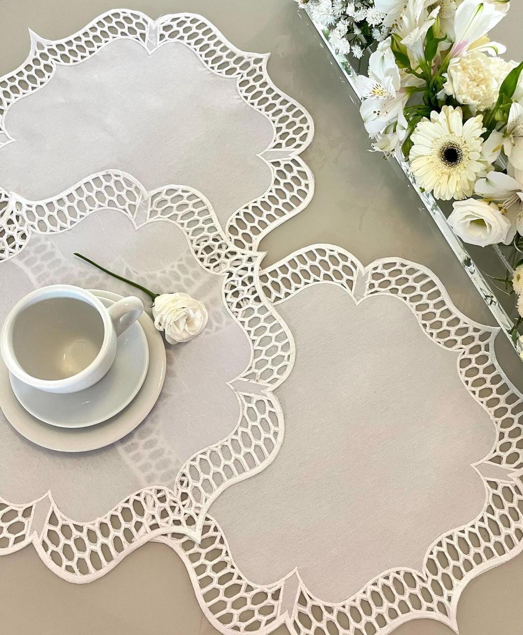 Confeccionado em tela de poliéster com algodão percal 180 fios, o jogo americano oferece um equilíbrio ideal entre resistência e suavidade ao toque. O destaque especial vai para o bordado richelieu feito com linha de seda, que agrega um charme artesanal e atemporal à peça.